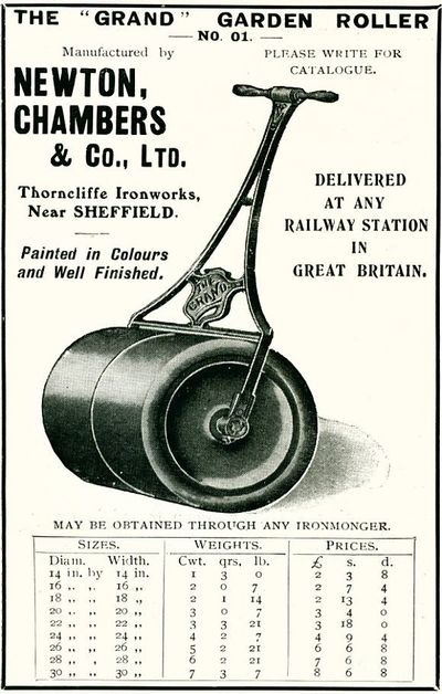 The typical construction of a split drum garden roller is shown in this section. An internal counterbalance weight is used to keep the handle upright. External counterbalance weights are also used and usually seen on the T Green & Sons garden rollers. This design can prove difficult to dismantle as the weights are pinned to the shaft. Intensive heat has to be applied and the pins punched out.